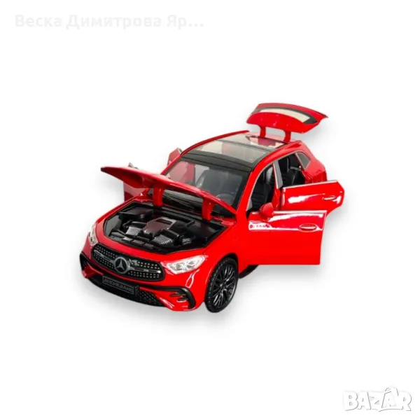 Тип продукт: Детски играчки ;Моделът Mercedes GLC в мащаб 1:32 е изработен от метал, предлагащ детайлна и реалистична изработка. Той разполага със светещи фарове и задни светлини, както и реалистични звуци на двигателя и аларма. Също така има функция за дърпане назад, която позволява на автомобила да се движи напред след като бъде пуснат. Вратите на модела могат да се отварят, което добавя още една нотка на реализъм. Моделът се предлага в два цвята – син и червен, което дава избор на любителите на колекционерски модели.