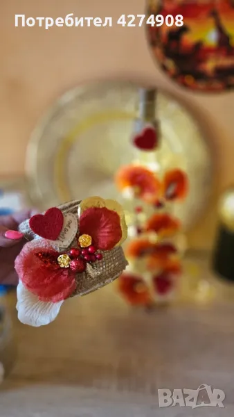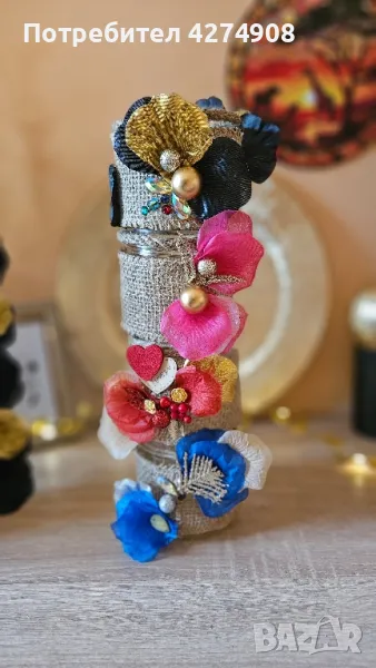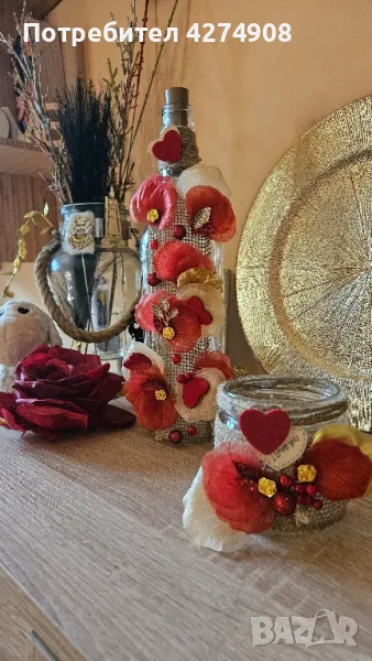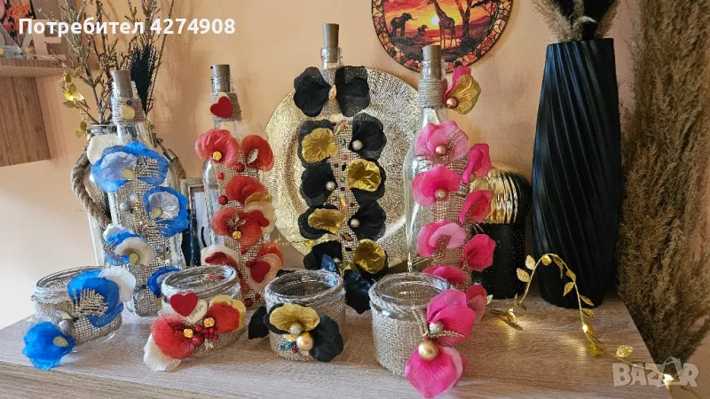 Ръчно изработени свещници и светещи бутилки. Моделите са по мой дизайн.Цена за Бутилка 28лв.Цена за малък свещник 15 лв.В комплект 40лв.Могат да се изработят и в други цветове.Подходящи за : 14-ти февруари, 8-ми март, пролет, лято, рожденни и именни дни, юбилейни, коледни- ( в другите ми обяви ) за декорация на дома , подарък за любим човек. Ако си харесате артикул и не е наличен, ще направя сходен. Понеже не повтарям.
