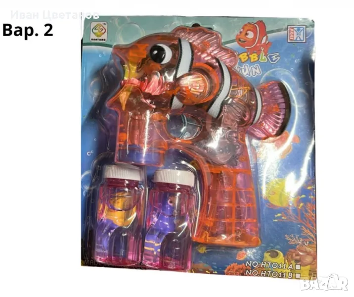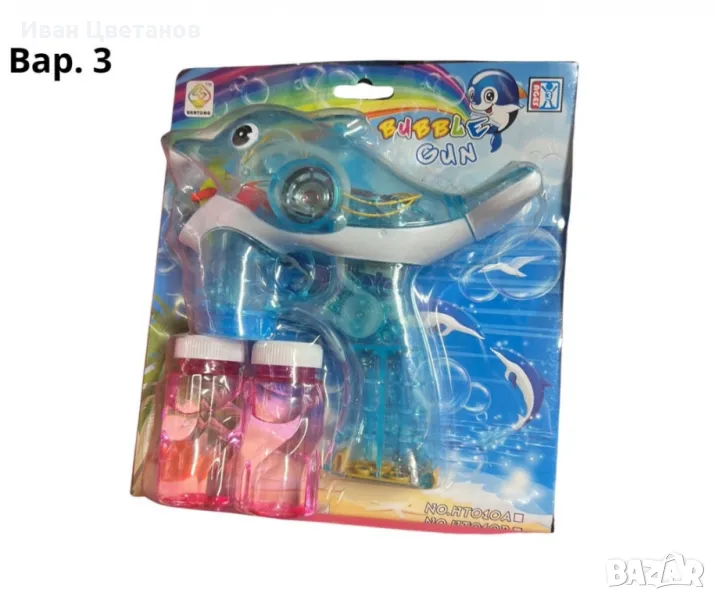 Тип продукт: Детски играчки ; Пистолет за водни мехурчета с размери 15 см, оборудван с два резервоара за сапунена вода. Подходящ за деца, предлага се в три различни варианта: син, оранжев и с форма на делфин. Създава множество забавни мехурчета и осигурява часове радост и развлечение на открито или вкъщи.