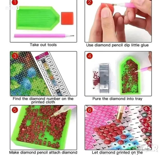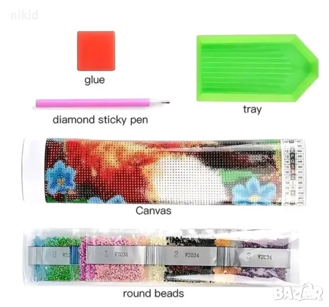 + купичка за мъниста и картина с фолио,която има готово нанесен слой лепило и по дадените цветове се залепват камъчета,много лесно,приятно и отморяващо,подходящо дори и за деца, не изисква особена сръчност и умения