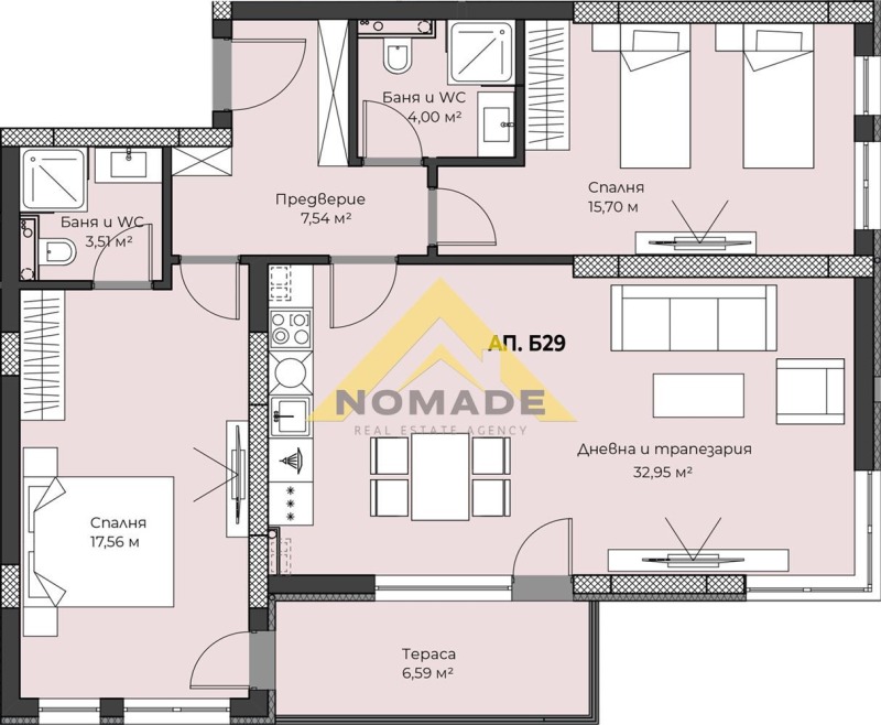 Жилището разполага с входно антре, дневна с трапезария и кухненски кът, две спални, две бани с тоалетни и тераса.