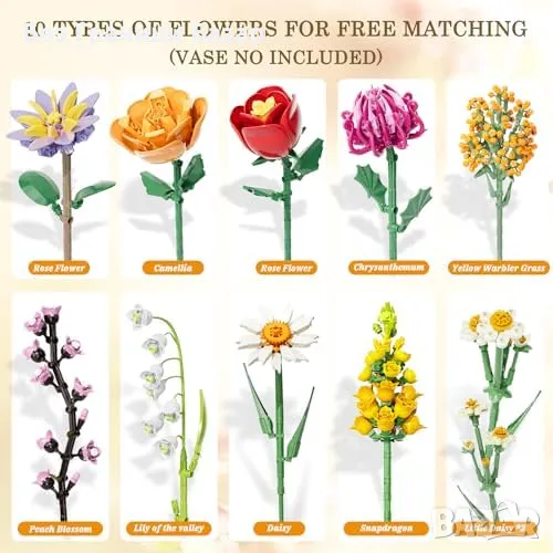 Комплект от 1070 части – 10 вида красиви цветя: Камелия, Роза, Клематис, Маргаритка, Хризантема, Лилиум и др.