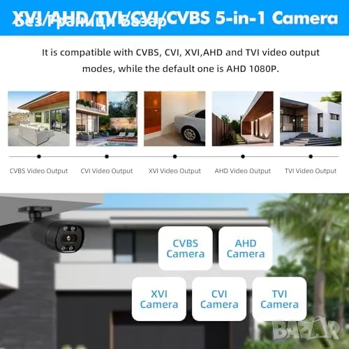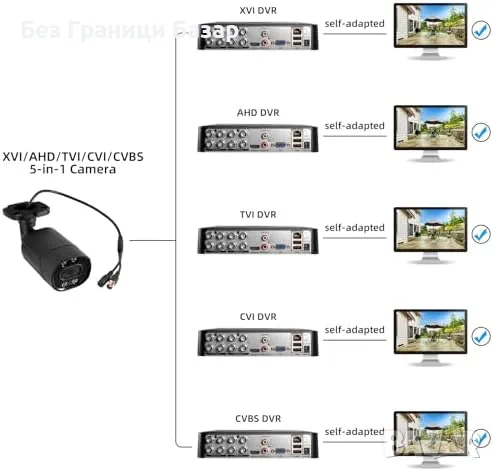 5-в-1 съвместимост – работи с XVI, TVI, CVI, AHD, CVBS аналогови DVR устройства
