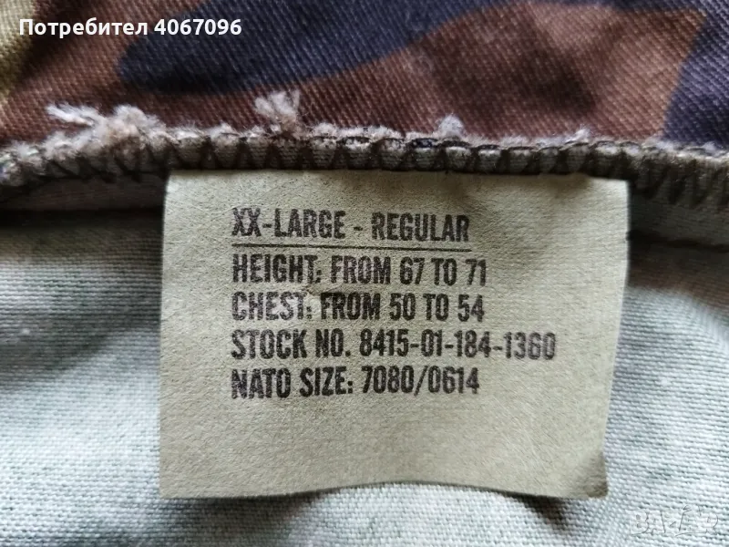 Чисто нов американски военен анорак Woodland, производство на Rotcho (U.S.A.). Състав 50% памук/ 50% полиестер. Един централен джоб на гърдите с метален цип, връзки за пристягане на качулката, кръста и в основата. Размер по етикет - XXLarge-Regular. Измерени: рамо - 68 см., подмишници - 82 см., височина от края до качулката (гръб) - 82 см., ръкав външно - 64 см., ръкав втр. - 52 см. Цена - 80 евро.