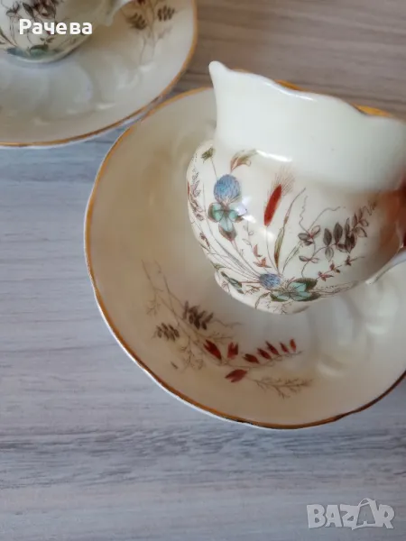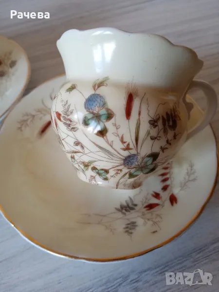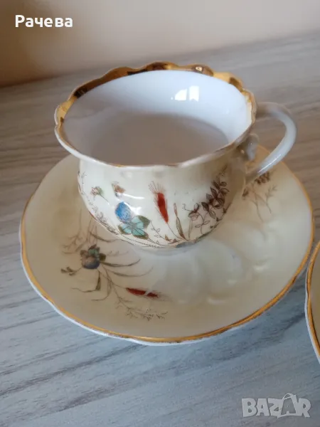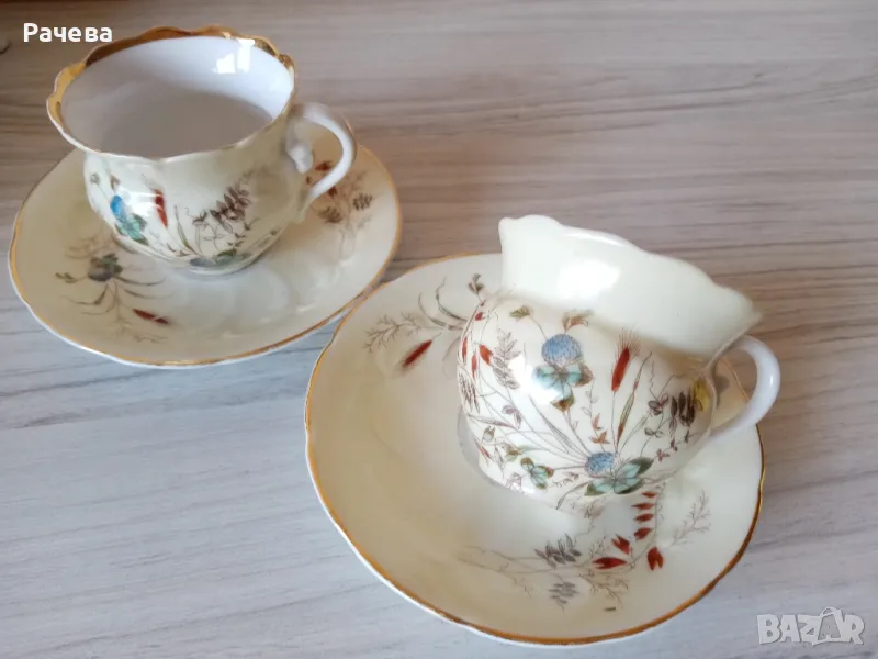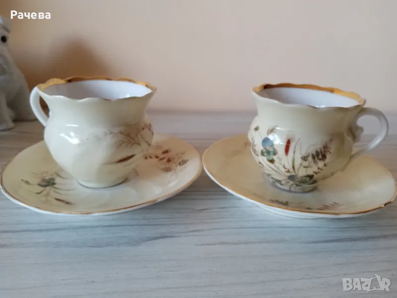 Carl TielschМного стари - над 120 гЧашите са много запазени. Чинииките имат изтриване на кант.Вместимост 120 млДекор детелини.Вътрешността на чашите е искрящо бяла.Цената е за брой