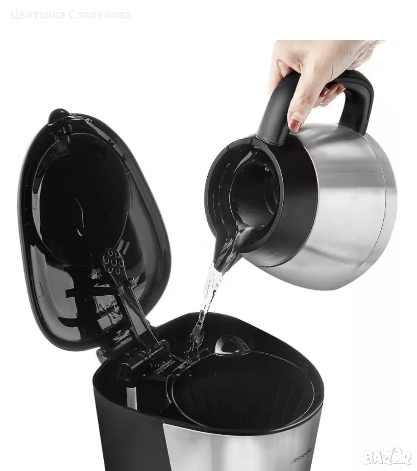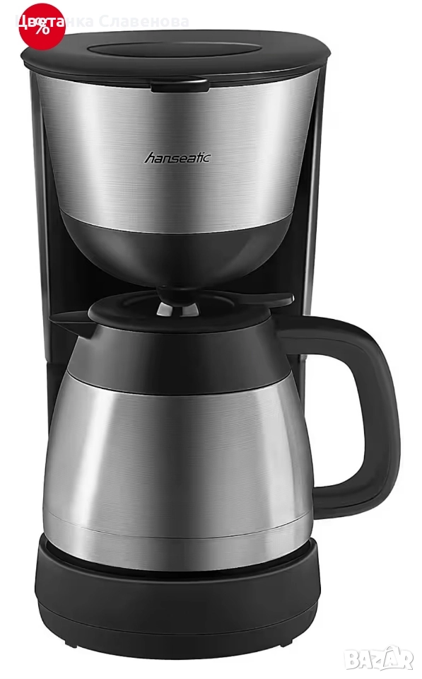 кафемашина Hanseatic HCM9001TJSD. С двустенна термокана от неръждаема стомана и капацитет от 1 литър, можете да приготвите до 8 чаши вкусно кафе – идеално за социални събирания или спокойни сутрини.