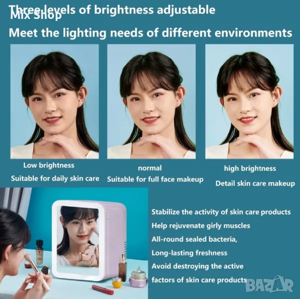 мини хладилника с огледало може да се използва за огледало за грим в спални, общежития, офиси и съблекални, много модерен и удобен. Деликатен грим, който ще озари перфектно детайлите на лицето ви.