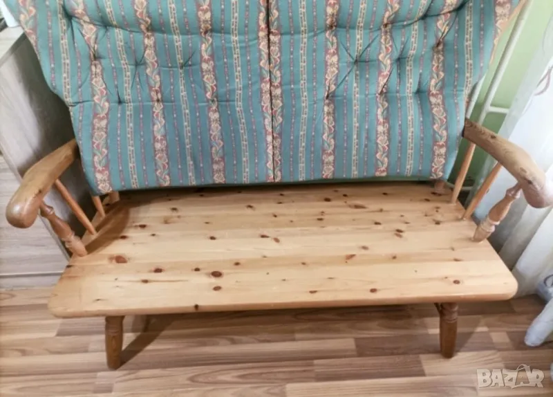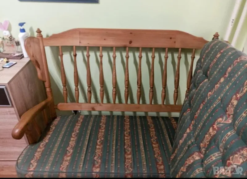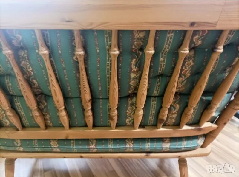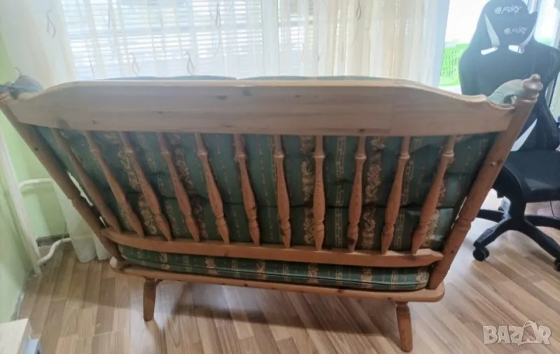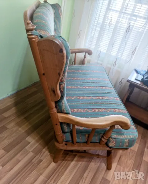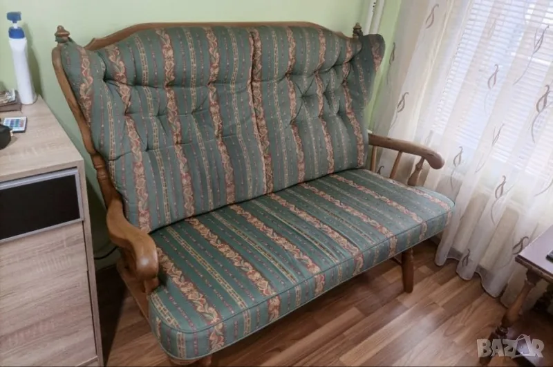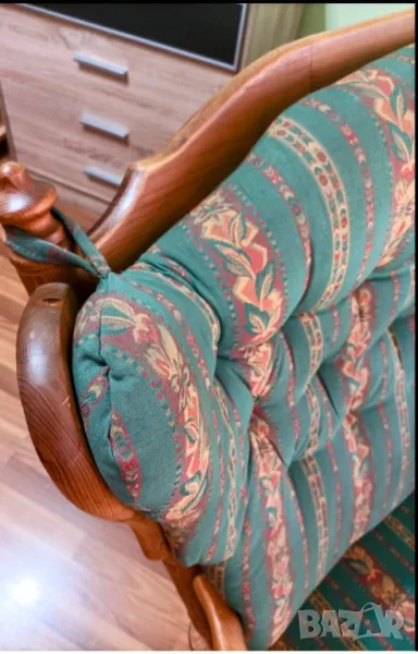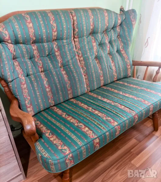 Комплект от канапе и ресло в ретро стил от масивна дървесина, свалящи се възглавници.