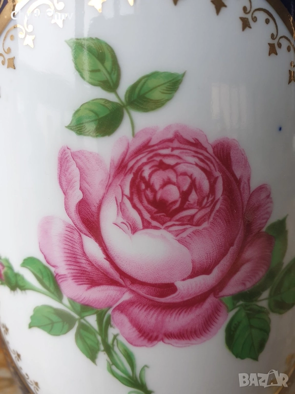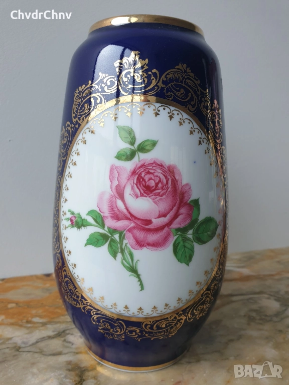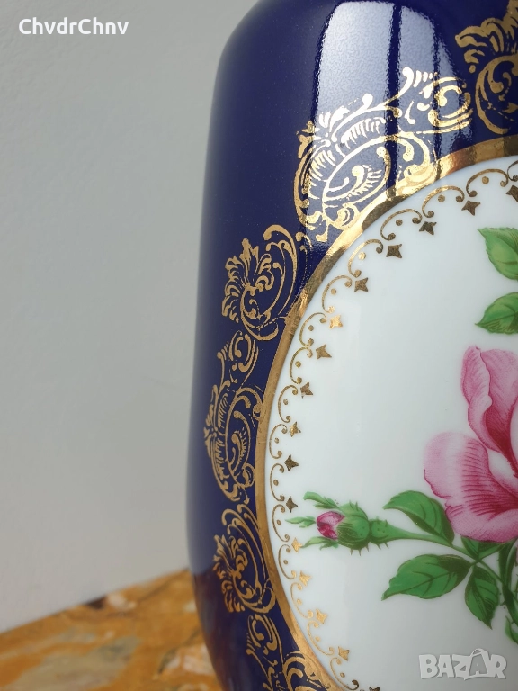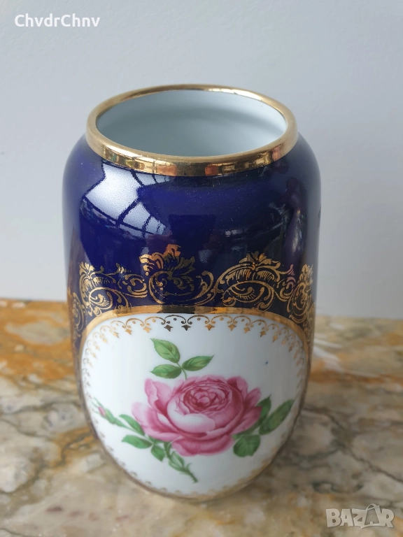 1960-те, кобалт с роза (ВАЗА 2) Височина 18 см, диаметър 11 см (макс), отвор 6 см, едностранна, ръчно рисувана (роза с листа), декорирана с 24К позлата, маркировка/печат отдолу на Royal Porzellan Bavaria KPM и че e ръчно направена.