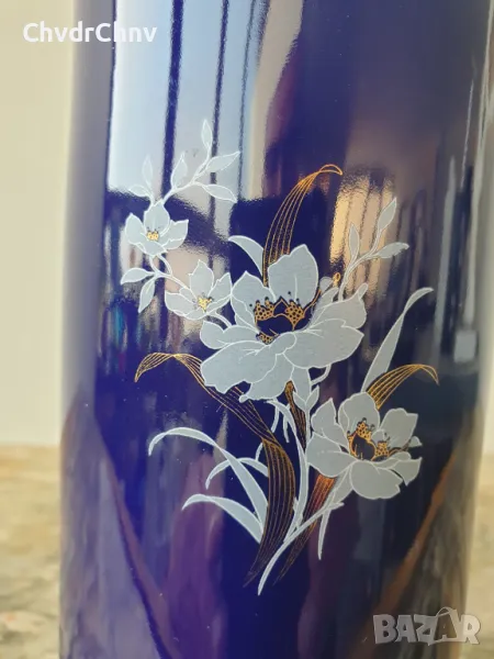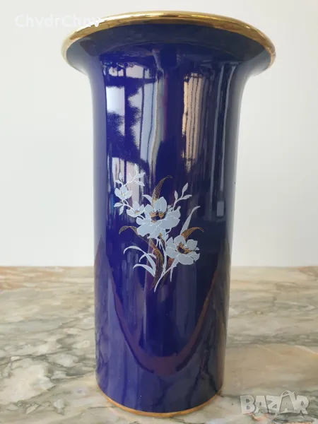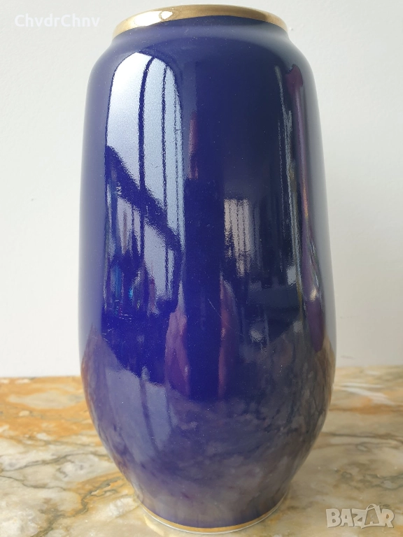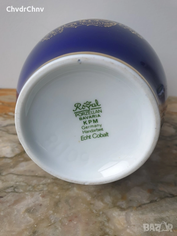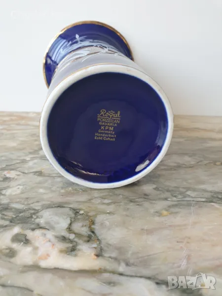 1960-те, кобалт цилиндрична (ВАЗА 1) Височина 21 см, диаметър 9 см, отвор 13 см, двустранна, ръчно рисувана, основен цвят тъмно синьо/кобалт, декорирана с 24К злато, маркировка/печат отдолу на Royal Porzellan Bavaria KPM и че e ръчно направена.