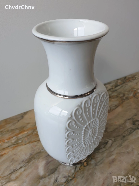 порцелан, релефна (бисквит/без гланц), декорирана със СРЕБРО, маркировка/печат отдолу на Royal Porzellan Bavaria KPM и че e ръчно направена. Вазата е много рядка заради частичния бисквит (повечето от този модел са с гланц) и среброто (другите нямат), в перфектно състояние (без никакви забележки).