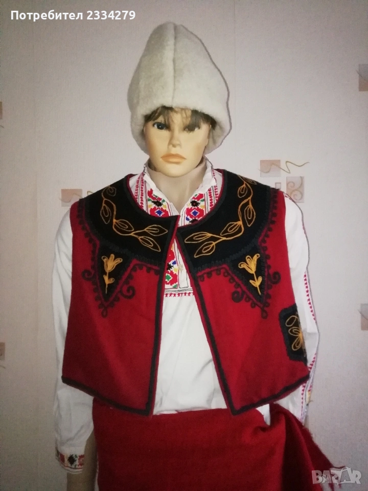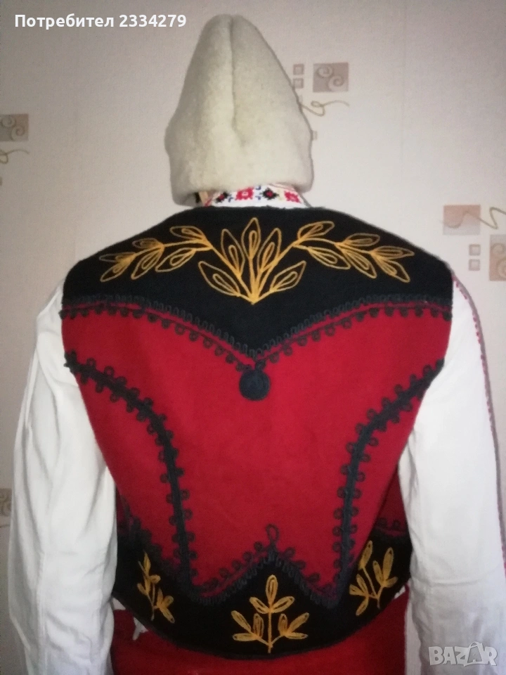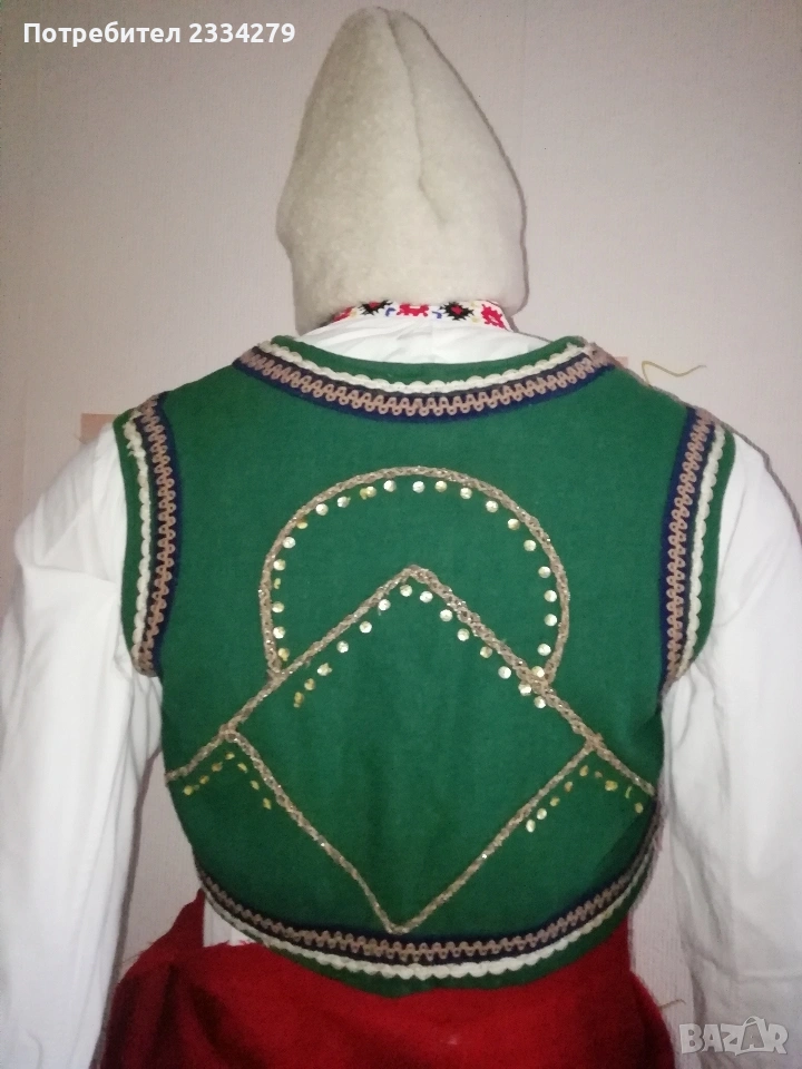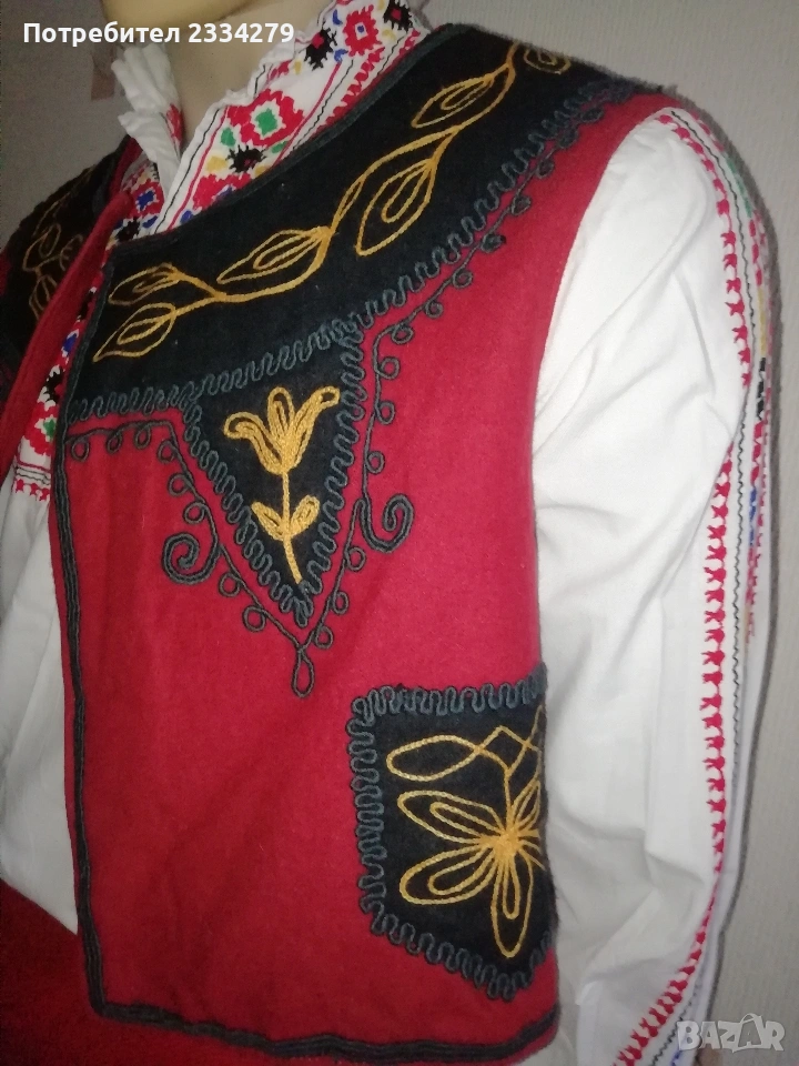 носия. Може да ползваш, колекция, декорация към битова къща, механа витрина. N:1 мъжки фолклорен тъмночервен елек, вълнен плат обшит с гайтани и флорални бродерия в жълто с друга декорация, размери: дължина 50см., рамена 46см. отговаря на,,L", цена 40€.; N:2 елек от зелен вълнен плат ръчно изработен, красиво орнаментиран с размери: дължина 40см.,рамена 40см.,цена 25€.; N:3 ръчно изработен от чиста вълна и орнаментиран с бродерия, размери: дължина 45см., рамена 31см., цена 17€.; N:4 женски елек от ,,ТРОНСКИЯТ КРАЙ", стара ръчна изработка бродерия, размери: дължина 41см., рамена 31см.,цена 15€. Всички са 100% автентичност изработени от различни шивачи и различни райони на Тракия.