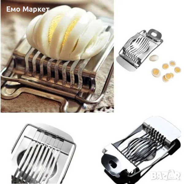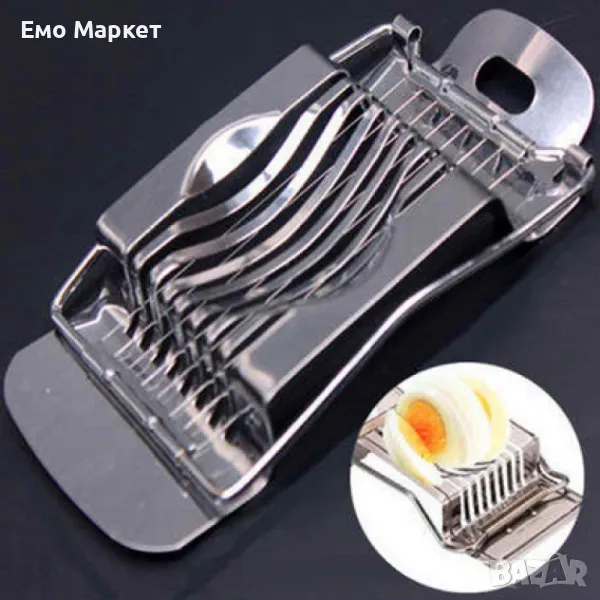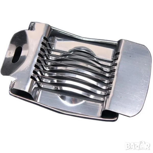 Компактен и удобен уред за ръчно рязане на варени яйца, изработен от висококачествена неръждаема стомана.
