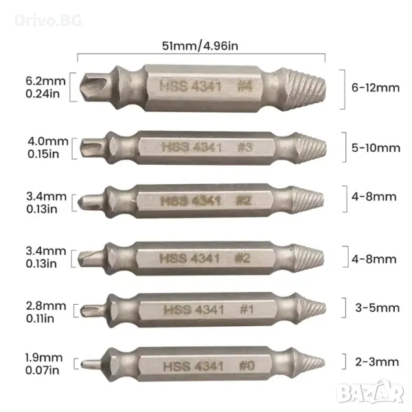 Комплектът съдържа 6 броя екстрактори със следните размери:
