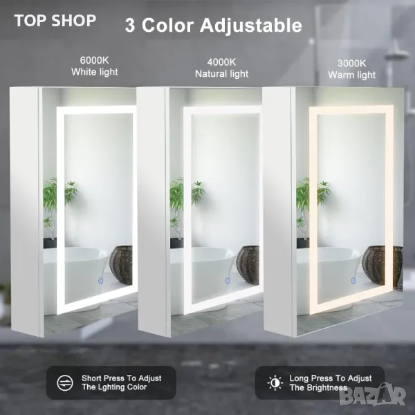 ?【Регулируема LED светлина】 Осветеният светодиоден шкаф за лекарства има трицветна светлина. Просто щракнете върху светодиодния сензор, за да манипулирате превключвателя. Регулирайте светлините, за да отговарят на различни сценарии на употреба. Огледален