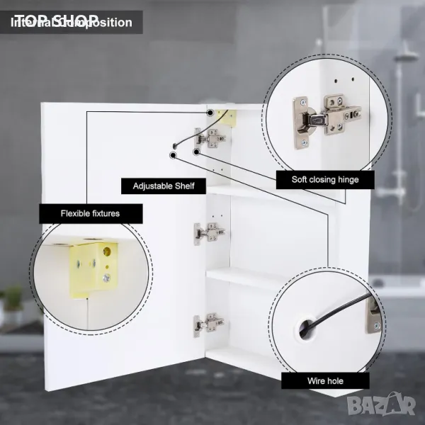 ?【Led Медицински шкаф, монтиран на стена】 3MM MDF задна платка, която осигурява максимална стабилност. Плоча от тризаминови частици с дебелина 15 mm E1, устойчива на влага и вода, адаптирана към околната среда в банята. Е незаменим партньор в живота ви.