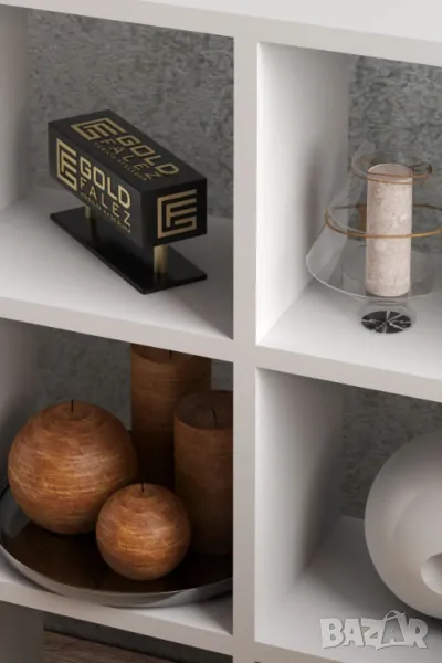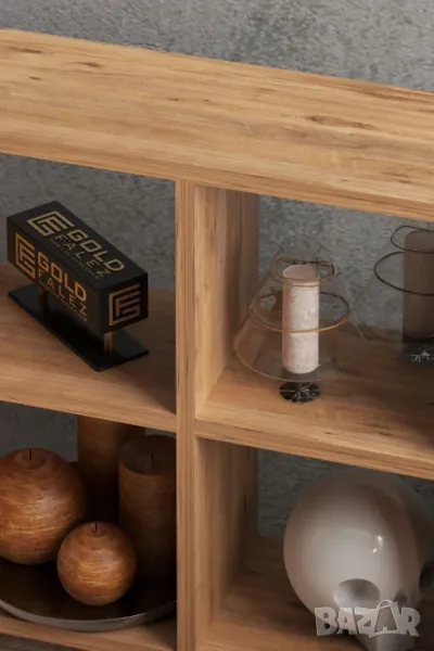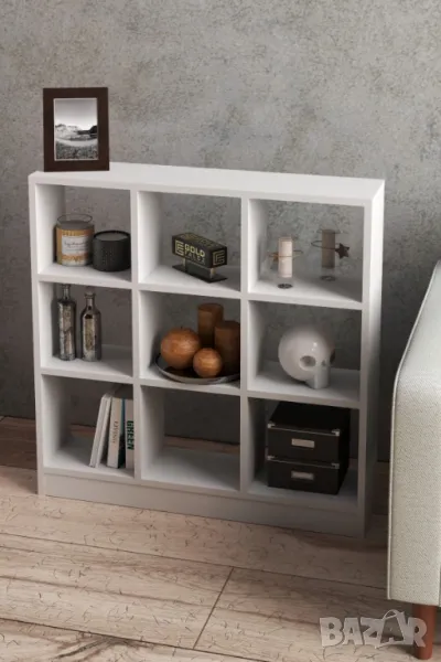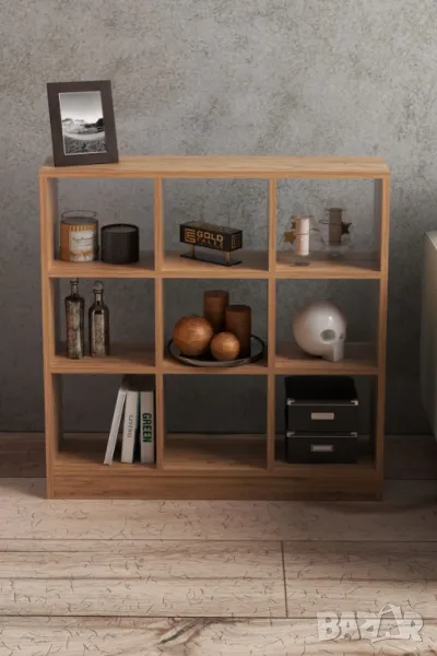 Дизайнът на шкафа включва 9 отделения, които предоставят достатъчно пространство за организиране на книги, кухненски принадлежности, декоративни елементи или други вещи. Придава модерен и елегантен вид, който лесно се вписва в различни интериорни стилове.