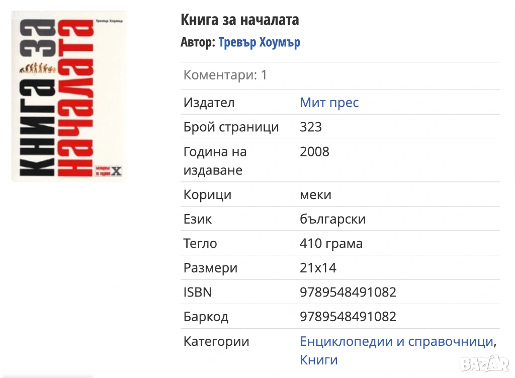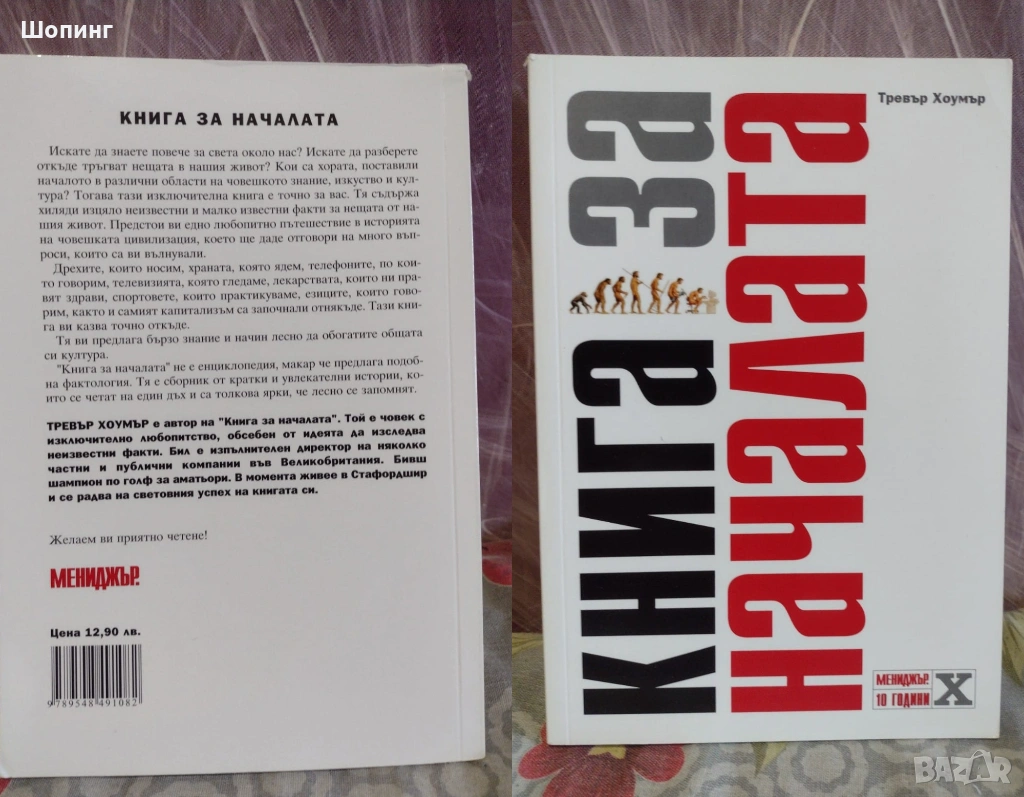 3. Книга за началата Автор: Тревър Хоумър - цена 6 евро. - Искате да знаете повече за света около нас? Искате да разберете откъде тръгват нещата в нашия живот? Кои са хората, поставили началото в различни области на човешкото знание, изкуство и култура? Тогава тази изключителна книга е точно за вас. Тя съдържа хиляди изцяло неизвестни и малко известни факти за нещата от нашия живот. Предстои ви едно любопитно пътешествие в историята на човешката цивилизация, което ще даде отговори на много въпроси, които са ви вълнували. Дрехите, които носим, храната, която ядем, телефоните, по които говорим, телевизията, която гледаме, лекарствата, които ни правят здрави, спортовете, които практикуваме, езиците, които говорим, както и самият капитализъм са започнали отнякъде. Тази книга ви казва точно откъде. Тя ви предлага бързо знание и начин лесно да обогатите общата си култура. „Книга за началата” не е енциклопедия, макар че предлага подобна фактология. Тя е сборник от кратки и увлекателни истории, които се четат на един дъх и са толкова ярки, че лесно се запомнят.