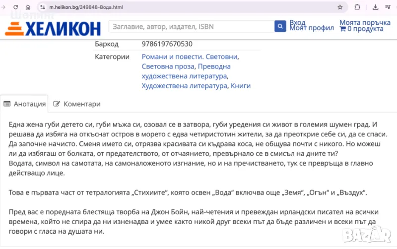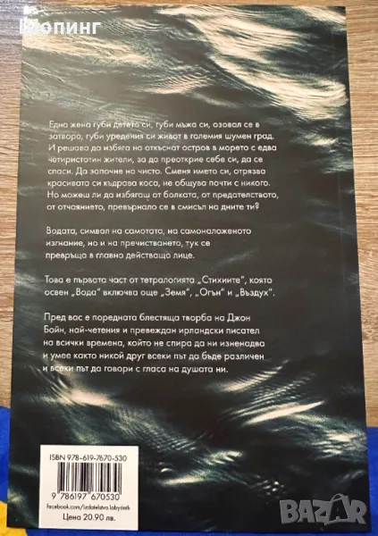 2. Чисто нова - "Вода" - Първа част от тетралогията "Стихиите" на Джон Бойн. - 10 евро - От автора на „Невидимите фурии на сърцето“. Една жена губи детето си, губи мъжа си, озовал се в затвора, губи уредения си живот в големия шумен град. И решава да избяга на откъснат остров в морето с едва четиристотин жители, за да преоткрие себе си, да се спаси. Да започне начисто. Сменя името си, отрязва красивата си къдрава коса, не общува почти с никого. Но можеш ли да избягаш от болката, от предателството, от отчаянието, превърнало се в смисъл на дните ти? Пред вас е поредната блестяща творба на Джон Бойн, най-четения и превеждан ирландски писател на всички времена, който не спира да ни изненадва и умее както никой друг всеки път да бъде различен и всеки път да говори с гласа на душата ни.