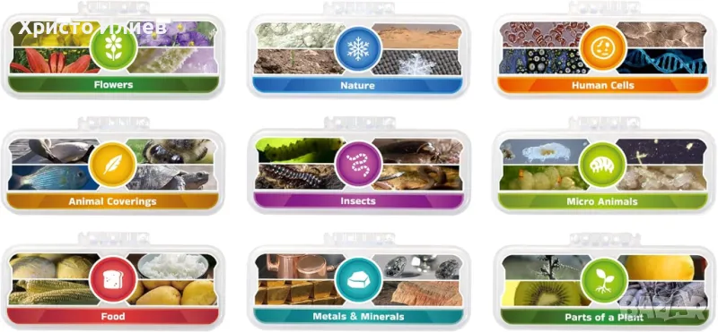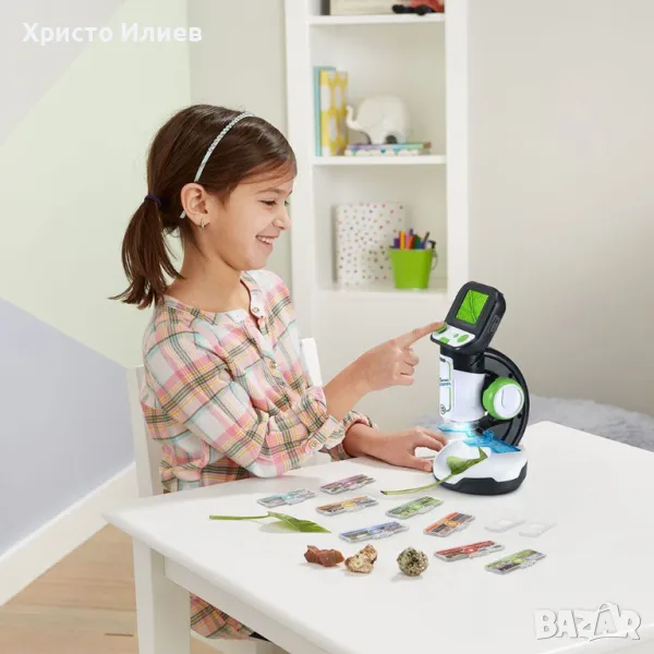 Ако децата ви проявяват интерес към науката, зарадвайте ги с този страхотен, интерактивен микроскоп. С него те ще могат да направят своите интересни открития. Микроскопът има 2.4-инчовия LCD екран и 18 интелигентни слайда. За да може детето ви да се забавлява, са добавени над 250 изображения и видеоклипа от BBC, които обхващат различна тематика - растения, насекоми, човешкото тяло и други. Децата могат да създават свои собствени творения, благодарение на включените 2 празни слайда. Микроскопът разполага и с място за SD карта памет.