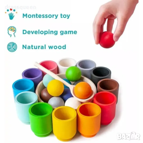 Комплектът включва 7 цветни топки с диаметър 30 мм, 7 чаши, дървена лъжица, дървена купа и ленена торбичка за съхранение.