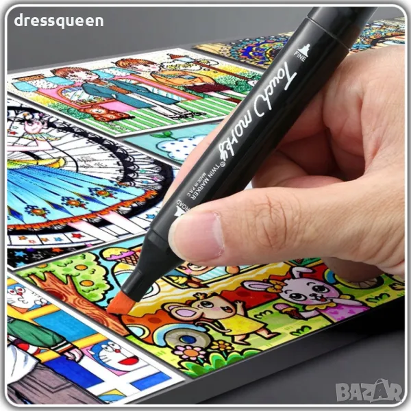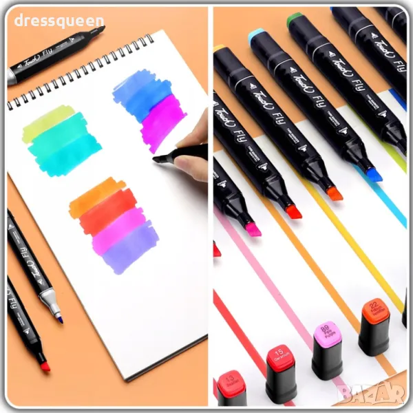 Двойни накрайници: Всеки маркер разполага с два накрайника – тънък за детайлни линии и широк за запълване на големи пространства.