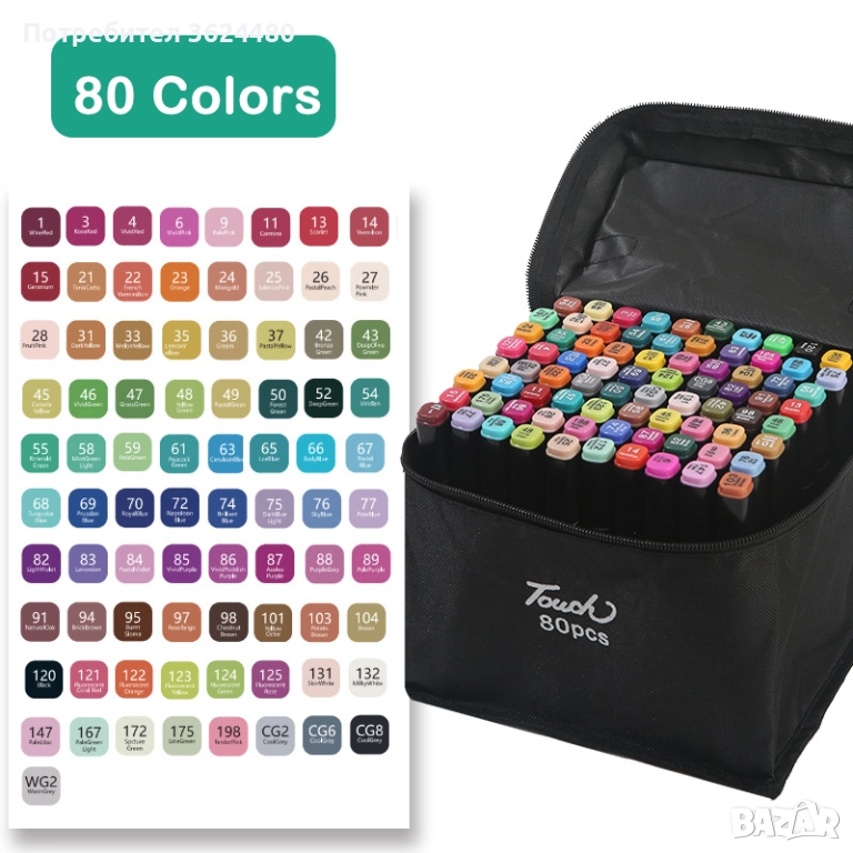 Този комплект от 80 маркера с два края е перфектният инструмент за всички, които обичат изкуството, дизайна и творческите проекти. С богата цветова палитра и практична чанта за носене, той е идеален за художници, илюстратори, графични дизайнери, студенти и любители на рисуването.