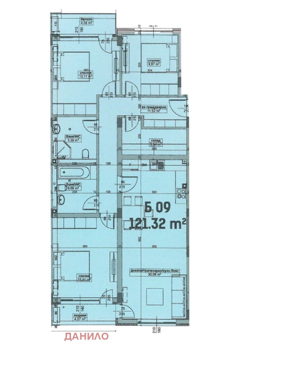 Предлагаме ви апартамент на трети жилищен етаж, с три спални, кухня с трапезария, всекидневна, коридор, антре, две бани с тоалетни, килер и две тераси. Общата квадратура е 134.79 кв.м., от които 121.32 кв.м. е чистата жилищна площ. Изложение две спални на север, третата спалня и дневната са на юг. Степента на завършеност е по БДС, 6 камерна, немска PVC дограма златен дъб, с австрийски обков, блиндирана входна врата, външна топлоизолация.
