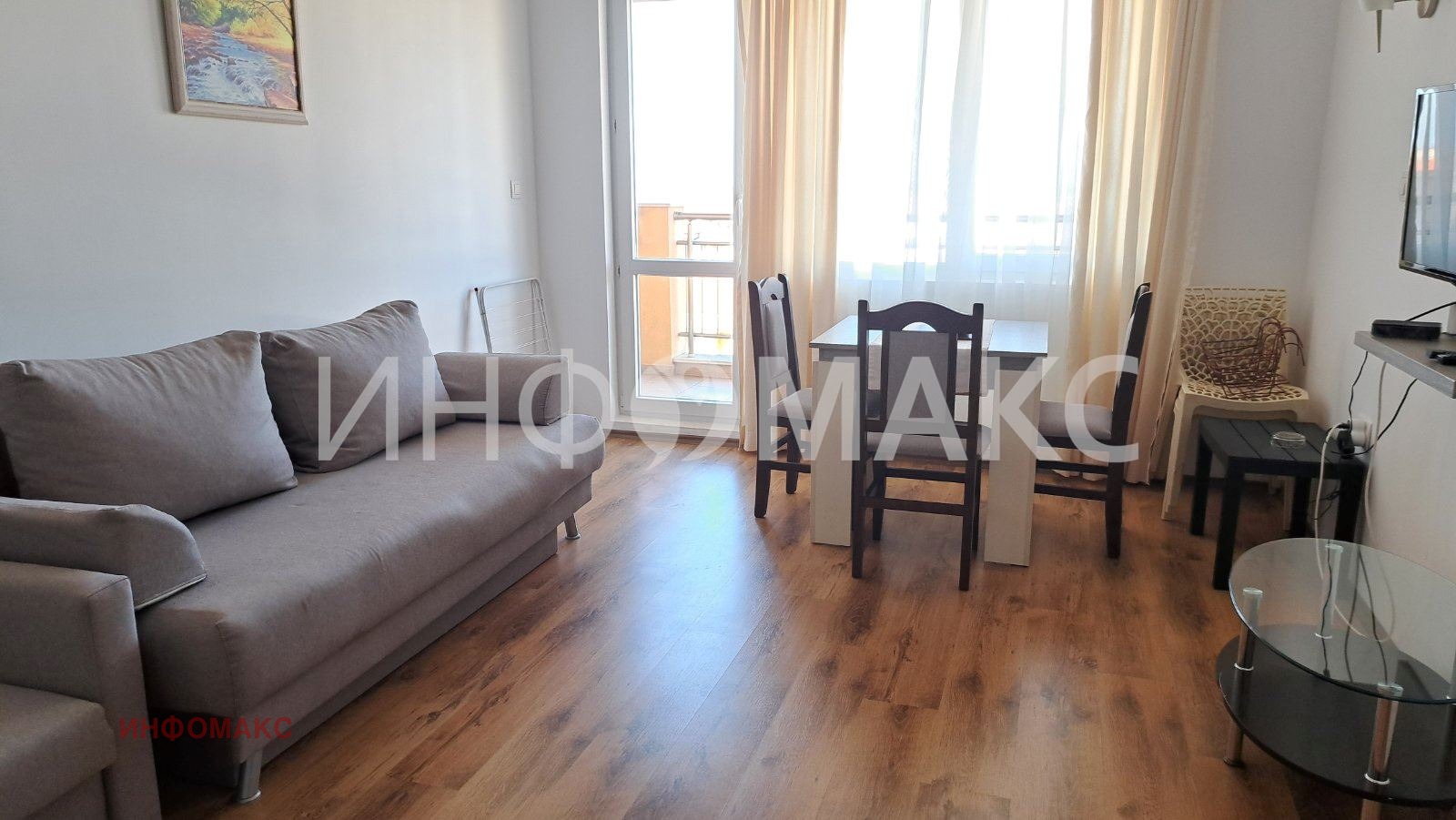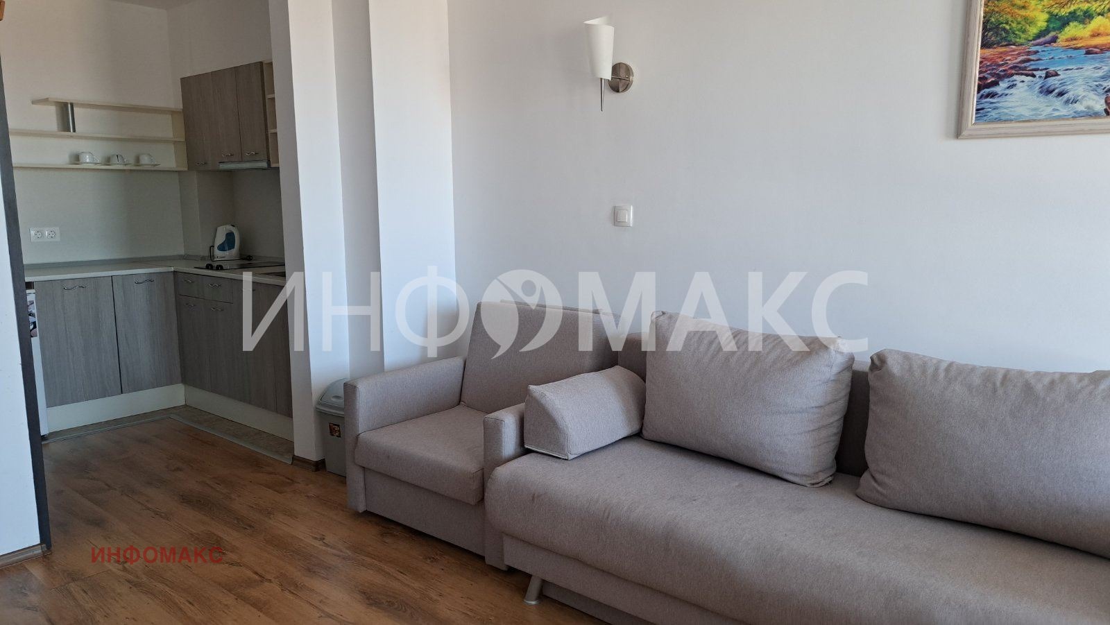коридор, дневна с кухненски бокс, спалня, баня с wc и тераса.