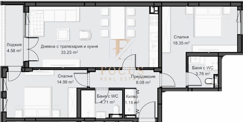 Апартаментът е с обща площ от 129,11 кв.м. със следното разпределение: антре, хол с кухненски бокс, две спални, две бани с тоалетни, килер и тераса.