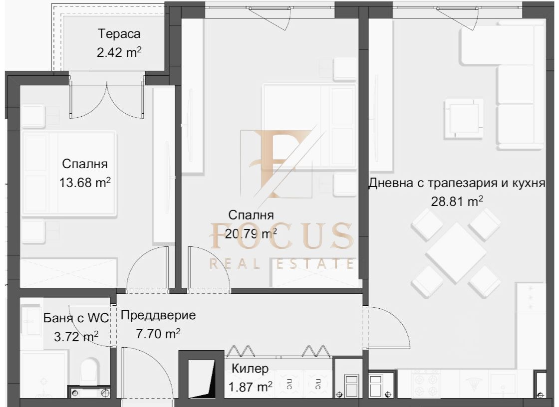 Апартаментът е с обща площ от 110,70 кв.м. със следното разпределение: антре, хол с кухненски бокс, две спални, баня с тоалетна, килер и тераса.