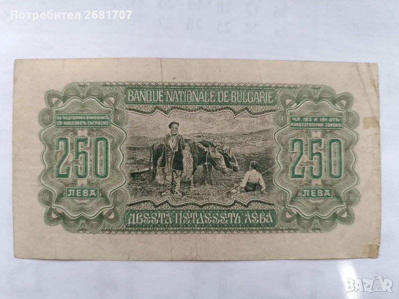 банкнота 250 лв 1943, снимка 1 - Нумизматика и бонистика - 48909436 банкнота 250 лв 1943, снимка 2 - Нумизматика и бонистика - 48909436 1/2