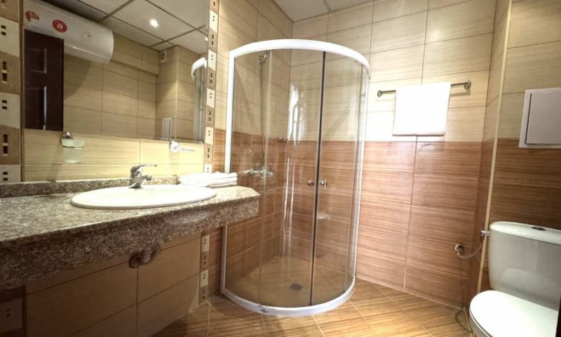 Санитарен възел с душ кабина и съвременни санитарни уреди;