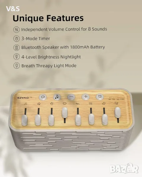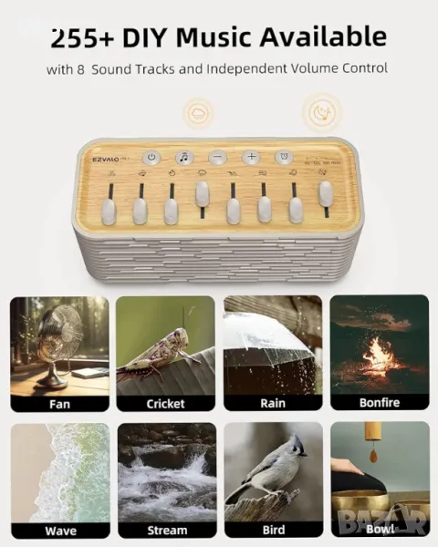 Звуковият генератор има множество релаксиращи звукови записи, всяка с независим контрол на силата на звука. Можете да слушате чист бял шум или да наслагвате любимите си звуци за персонализиран сън, релаксация или отпускане. За възрастни и деца