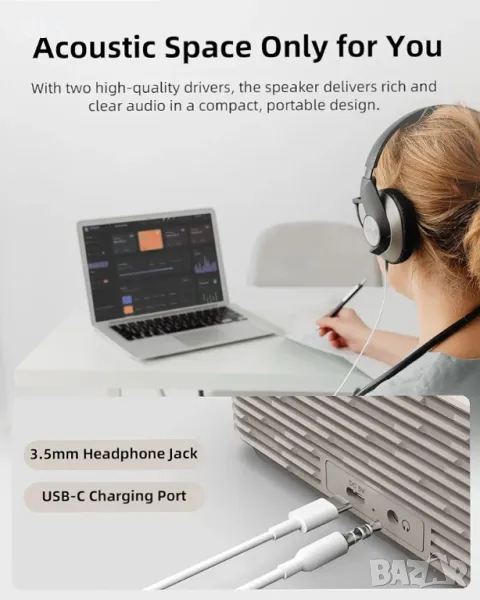Звуковото устройство има малки размери и вградена батерия от 1800 mAh, която осигурява до 10 часа възпроизвеждане. Вземете го със себе си лесно, където и да ви потрябва