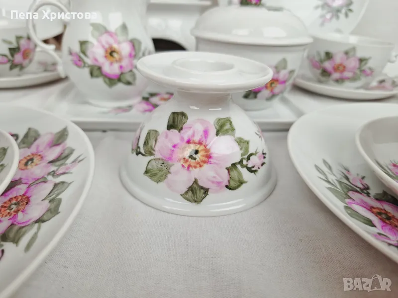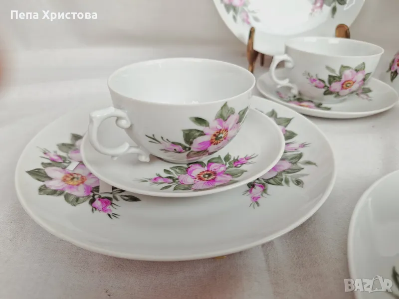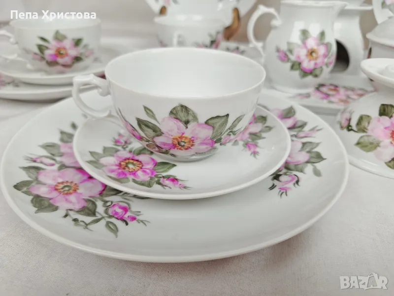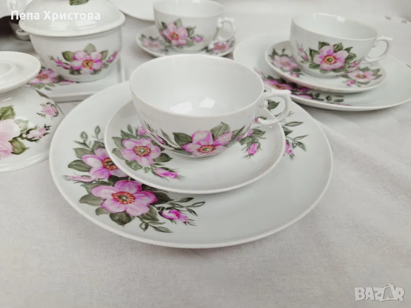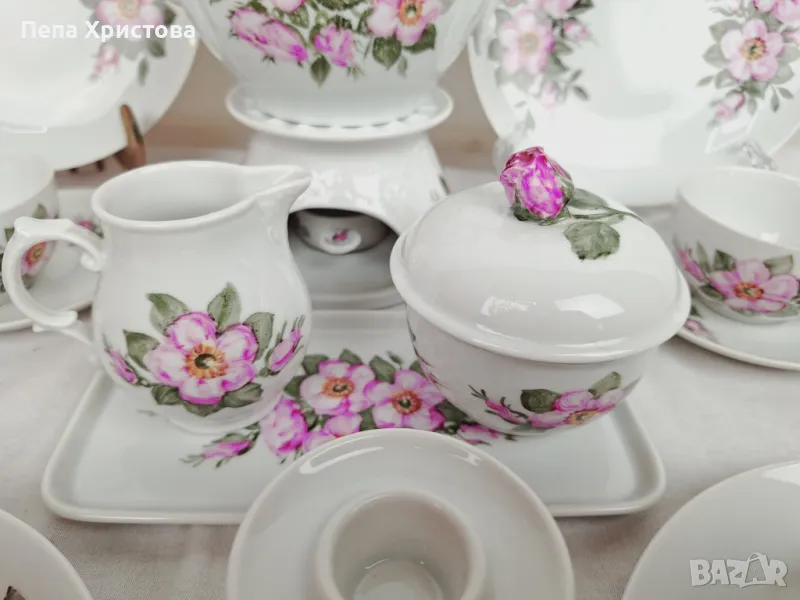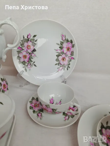 Сервиз за чай от немски порцелан Fürstenberg с декор "цъфнала шипка" в много нежен цвят. Маркировката е използвана между 1949 - 1990г.