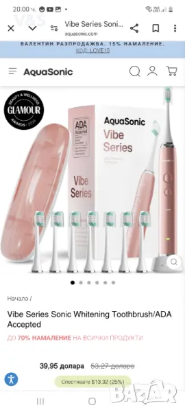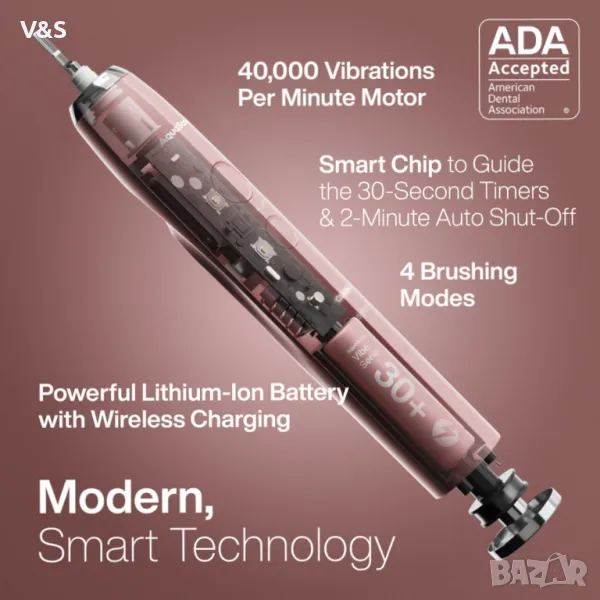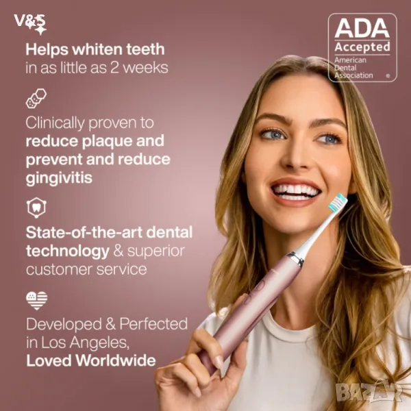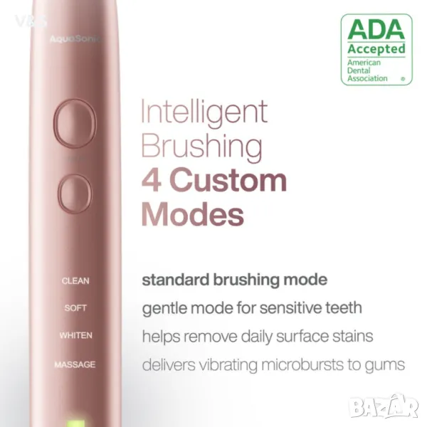 Прието от Съвета по научни въпроси на Американската дентална асоциация (ADA) – Ние влагаме парите си там, където е вашата уста. Инвестирането в първокласни технологии за грижа за устната кухина спечели на серията Vibe престижния знак за одобрение на ADA. Той е показал ефикасност при премахване на плаката и помага за предотвратяване и намаляване на възпалението на венците. Серията Vibe надхвърля простото почистване на зъбите – тя осигурява пълна орална грижа с уникални режими, които включват един за избелване и полиране на зъбите и един за подобряване на здравето на венците.