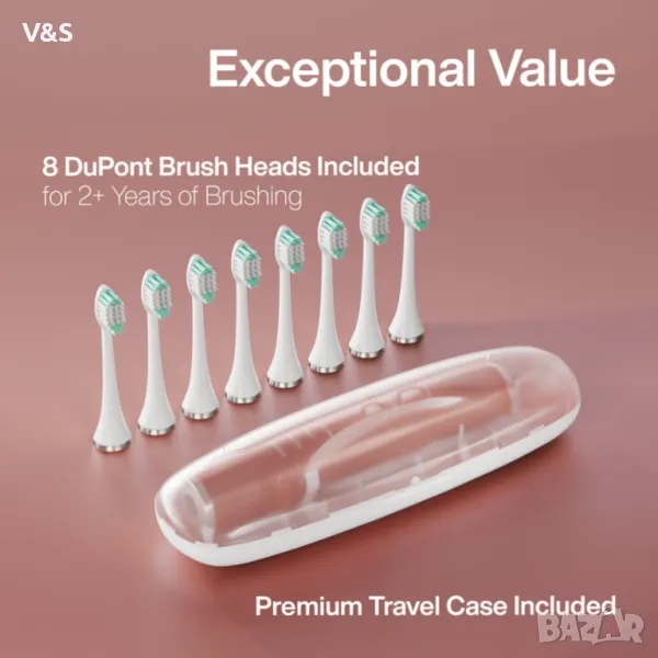 Включени са 8 глави за четки на DuPont и калъф за пътуване - всяка четка за зъби от серията Vibe се доставя с 8 глави за четки, проектирани от световноизвестния DuPont; световен лидер в науката за качеството и материалите. Всяка глава на четката издържа 3 месеца, така че 8 ще издържат 2 години. Включен е и удобен персонализиран калъф за пътуване с твърда обвивка, изработен от пластмаса без BPA с място за две глави на четка. Серията Vibe може да издържи 4 пълни седмици (2 минути/2 пъти на ден) с пълно зареждане, така че е идеална за пътуване в движение с включения калъф за пътуване.