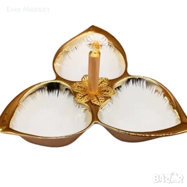 Луксозна порцеланова купа в бяло и златисто, с три гнезда за ядки. → Обява 48913143