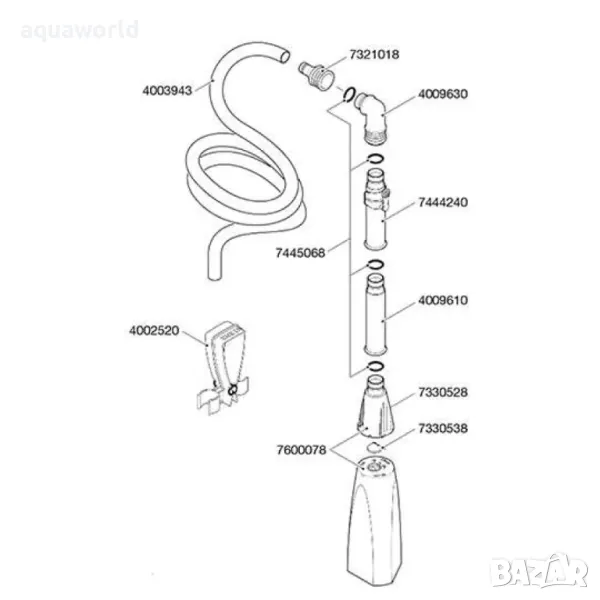 Този сифон на производителя Eheim има стоп бутон, който прекратява моментално всмукването на вода. Триъгълната му форма позволява почистването на ъглите на аквариума. Комплектът включва : 582 мм. маркуч, всмукателен елемент, 3бр. тръби (9 см.), 1бр. тръба със стоп бутон, Г-образен преход, щипка за фиксиране.