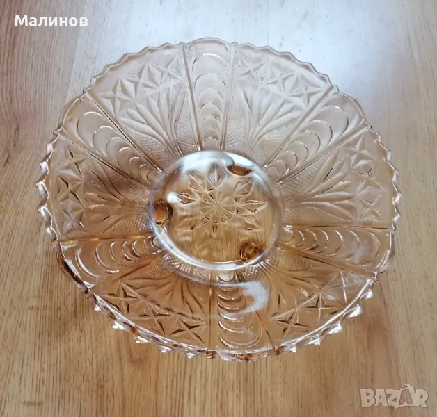 Фруктиера, диаметър 22 см, цветно стъкло (кафеникава), изцяло с релефни орнаменти отдолу, с оформени 3 крачета, запазена, без забележки.