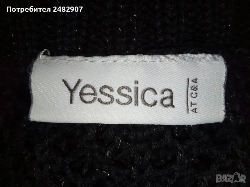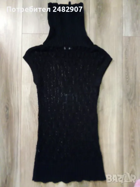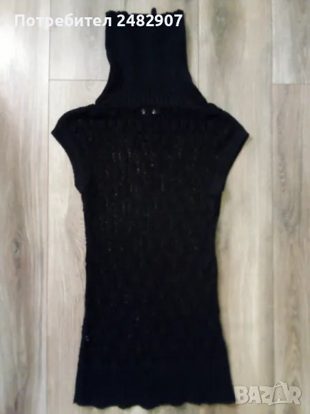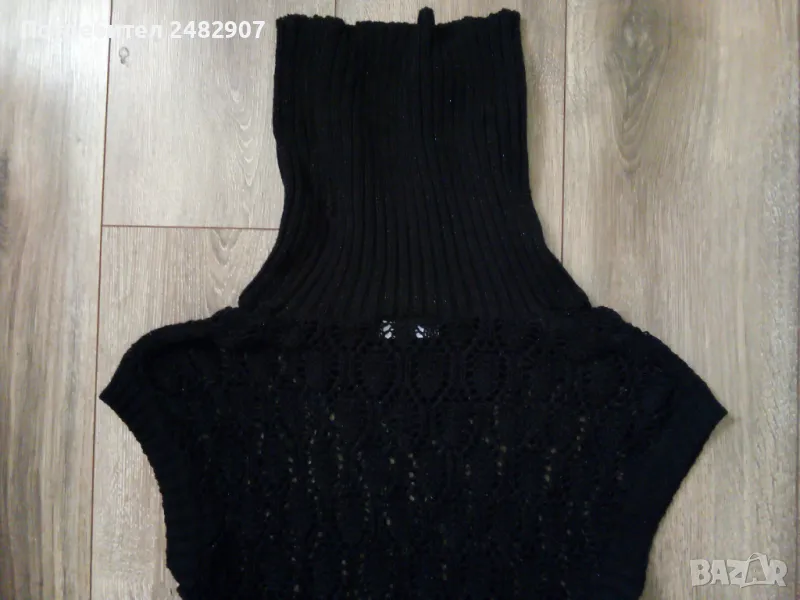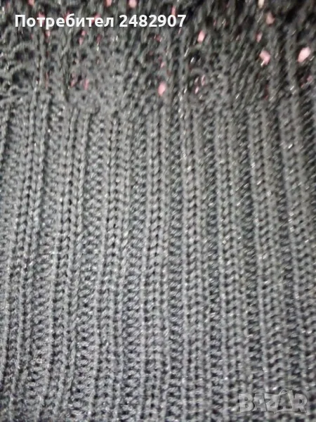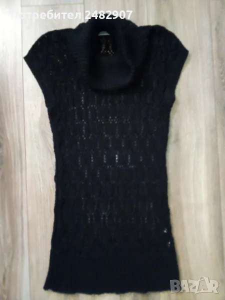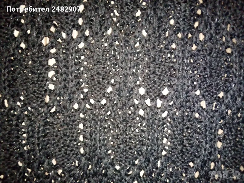 Машинно плетен черен мрежест дамски блузон с поло яка и блестящ ефект, размер S. Ширина в раменете - 52 см, ширина под мишниците - 43 см, ширина в долната част - 45 см, дължина от рамото до долу - 82 см, височина на полото - 28 см, ширина на полото - 25 см. Много запазен, почти не е използван, без забележки.