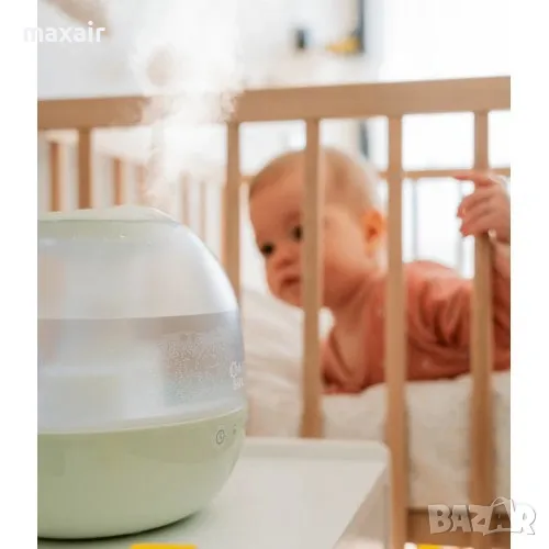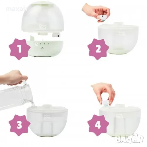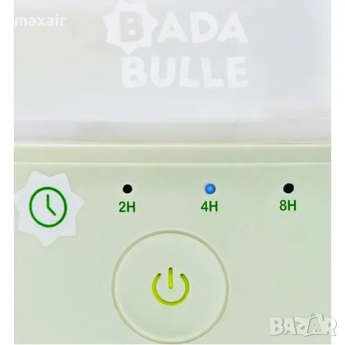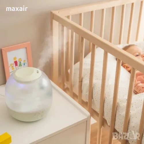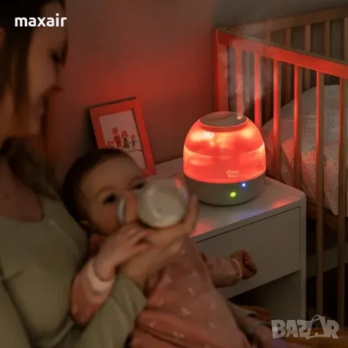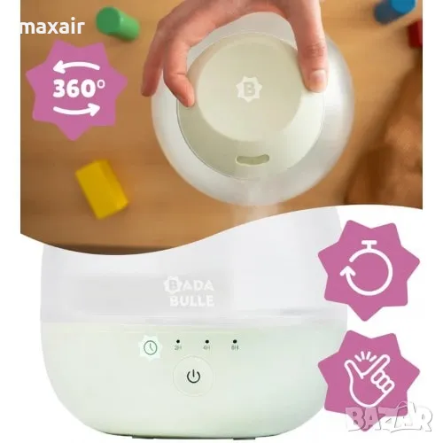 Овлажнителят Bubble е създаден да поддържа оптимална влажност в детската стая. Благодарение на компактния дизайн, уредът е подходящ дори и за по-малки помещения. Работи до 16 часа с едно пълнене на водния резервоар (2л) и има възможност за настройка на таймер на 2, 4 или 8 часа на работа. Изключва се автоматично, когато нивото на водата е ниско. Вградената функция нощна лампа с променящи се цветове допринася за създаването на успокояваща и комфортна среда в стаята. 360° извод за парата позволява да насочвате парата в различни посоки. Има възможност за добавяне на етерични масла.