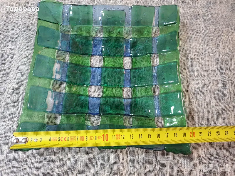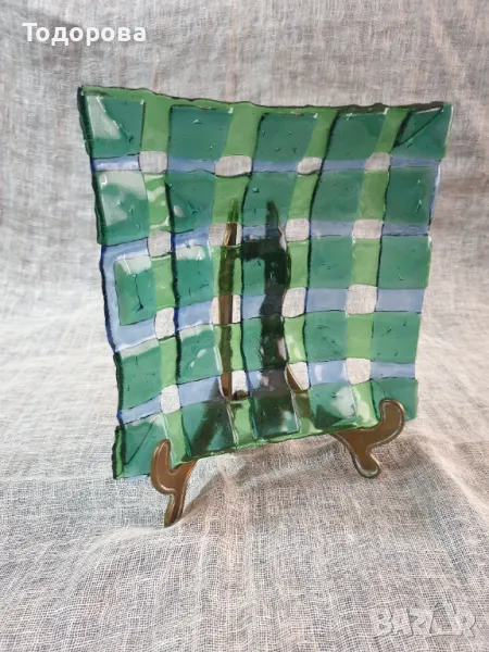 Стъклена квадратна фруктиера от цветно стъкло.Размери- 20 х 20 см.