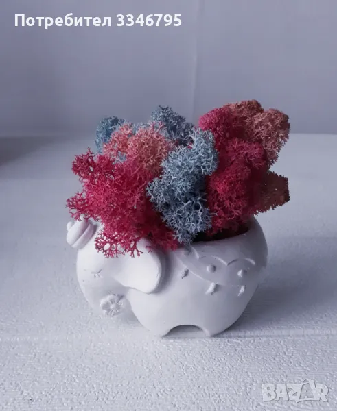 Гипсова кашпа декорирана със скандинавски мъх. Мъха коригира влажността на въздуха в помещението и не задържа прах Оригинален и нестандартен подарък за всякакъв повод. Височина на кашпата с мъхчетата е около 8см.
