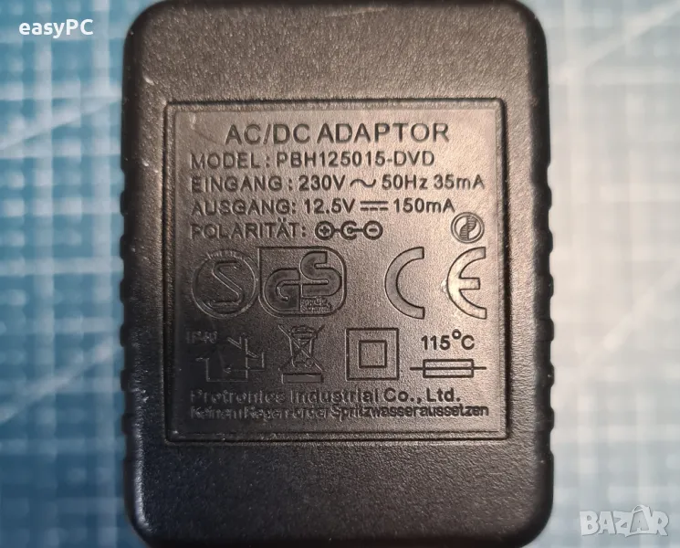 AC-DC адаптор PBH125015-DVD с входно напрежение 230VAC и изходно напрежение 12.5VDC, ток 150mA. Захранваща букса 5.5x2.5mm с минус в средата на буксата.