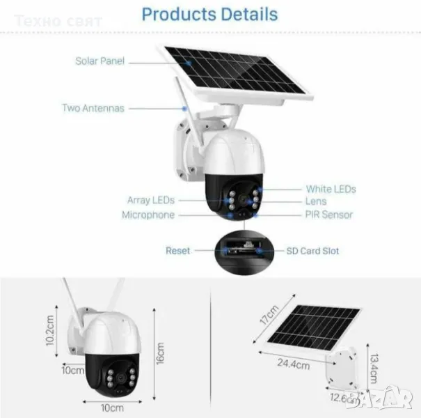 Соларна камера за видео наблюдение, със захранване от соларен (фотоволтаичен) панел. Камерата може да бъде поставена външно, без нуждата от окабеляване. Клас IP67. Прахо и влагоузтоичива.