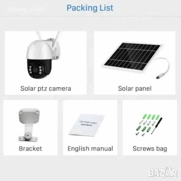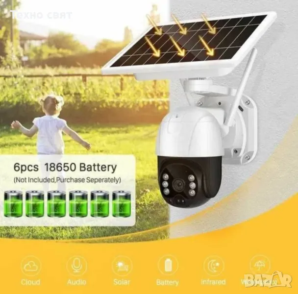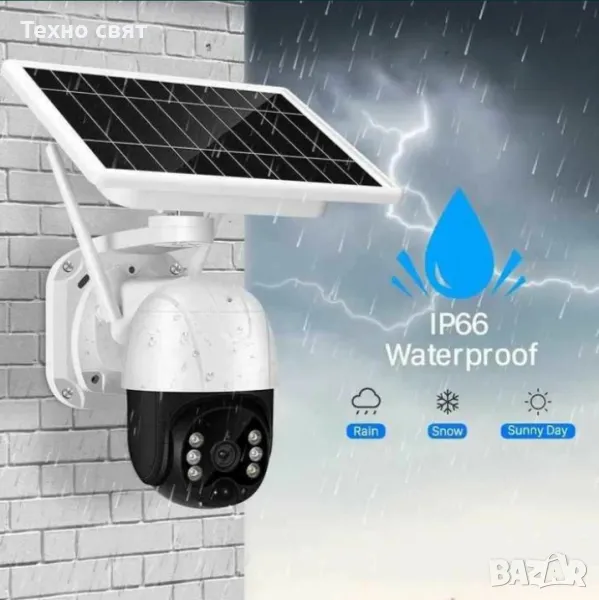 Соларна камера за видео наблюдение, със захранване от соларен (фотоволтаичен) панел. Камерата може да бъде поставена външно, без нуждата от окабеляване. Клас IP67. Прахо и влагоузтоичива.