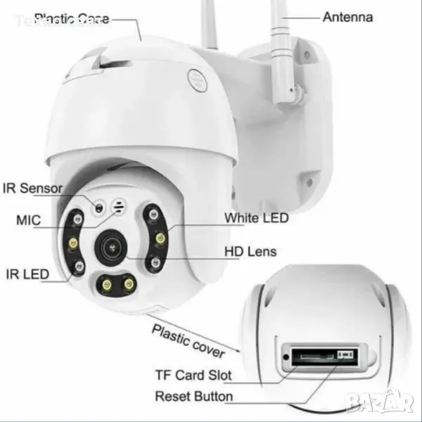 5X увеличение за наблюдение с автоматично следене на движението, цветно нощно виждане и двупосочна аудио връзка с управление от всеки телефон (Android, Apple) или компютър. С нова подобрена матрица. Камерата разполага с изкуствен интелект, който автоматично засича човешката форма и моментално изпраща известие на смартфона Ви. Снабдена е с мотор и се завърта във всички посоки. Управлението става директно, чрез смартфона – отдалечено. Камерата изпраща нотификации при засичане на движение и звук, директно на смартфона, чрез приложението, с което работи. PTZ управление: 3550-градусово хоризонтално завъртане и 85-градусово вертикално, като по този начин обхваща по-голям периметър. Отлично качество на картината с 6mpx бленда.