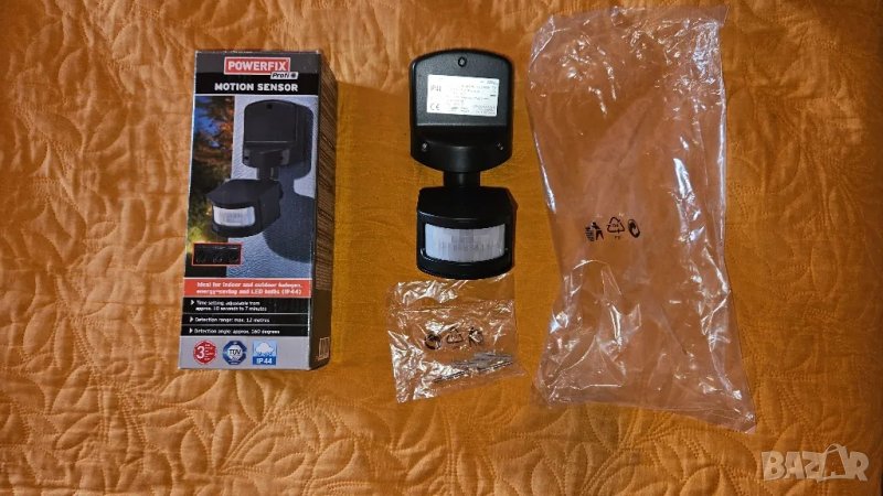Сензор за движениеИдеален са халогенни, енергоспестяващи и светодиоди тела на закрито и открито (IP44)Настройка на времето: може да се настройва индивидуално на ок. 10 секунди до 7 минути.Засичане на движение в радиус : макс. 12 метра.Ъгъл на регистриране на движение: ок. 160 градуса. Разположение на сензора : вертикално и хоризонтално. Може да се вземе на място лично или доставка с куриер.
